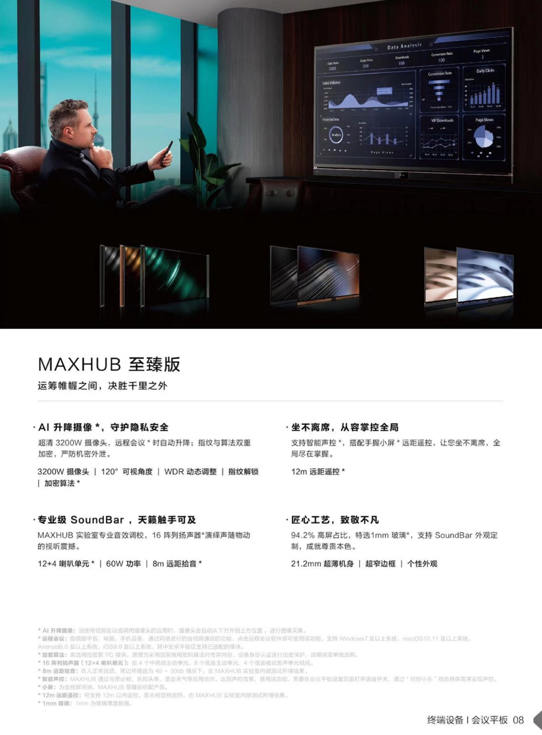 MAXHUB是視臻科技的自主*,誕生于2017年,是國(guó)內(nèi)會(huì)議平板品類(lèi)的開(kāi)創(chuàng)者和引領(lǐng)者,來(lái)自第三方奧維的數(shù)據(jù)顯示,2022年MAXHUB銷(xiāo)量市占率達(dá)28.8%。截至目前,MAXHUB已成功走進(jìn)全球78個(gè)*,超50萬(wàn)間會(huì)議室都能看到MAXHUB的身影,超80%中國(guó)500強(qiáng)企業(yè)都在使用MAXHUB提升會(huì)議和協(xié)同效率*。 創(chuàng)新成就更多可能,MAXHUB持續(xù)根據(jù)用戶(hù)需求迭代升級(jí)技術(shù)和產(chǎn)品。2023年,MAXHUB首度在行業(yè)內(nèi)定義三大空間,發(fā)布三大空間數(shù)字化解決方案,以覆蓋全場(chǎng)景的協(xié)同終端新品,為組織帶來(lái)更高效的會(huì)議辦公體驗(yàn)。 服務(wù)無(wú)止境,滿意無(wú)終點(diǎn)。MAXHUB始終堅(jiān)持以“用戶(hù)為中心”,擁有完善的售后體系,2000個(gè)售后服務(wù)網(wǎng)點(diǎn)和10000名官方認(rèn)證工程師,為全國(guó)用戶(hù)提供設(shè)備咨詢(xún)、送貨、安裝、培訓(xùn)、維修等*專(zhuān)業(yè)服務(wù),對(duì) 于一、二線城市,還提供48小時(shí)內(nèi)上門(mén)服務(wù),真正做到“只要有MAXHUB的地方,就會(huì)有 MAXHUB的服務(wù)”。 打造更好的產(chǎn)品,追求更高的品質(zhì),提供更優(yōu)的服務(wù),MAXHUB將致力于提升協(xié)同共創(chuàng)的效能,把高效轉(zhuǎn)化為企業(yè)的核心生產(chǎn)力,為社會(huì)創(chuàng)造更大的價(jià)值。